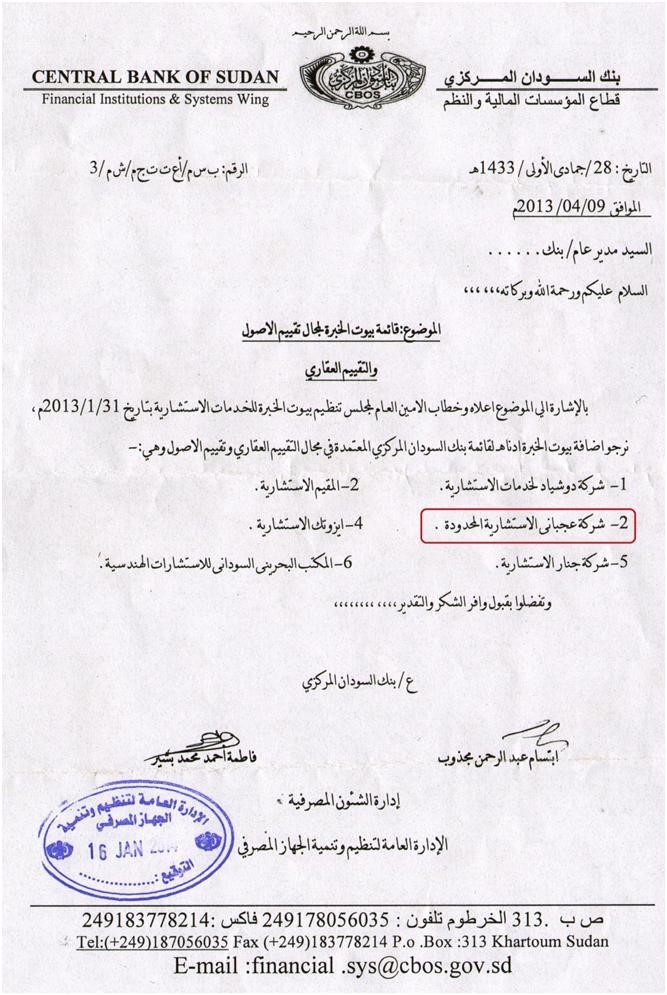 Agabani Consultancy ltd is approved as a real-estate and fixed assets evaluator by the Central Bank of Sudan.